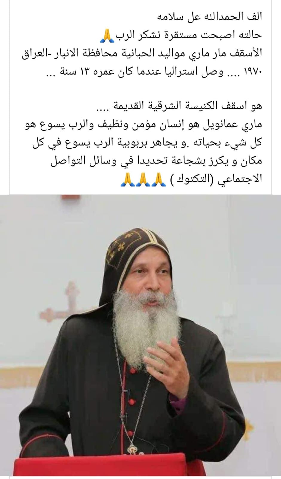 يذكر أن المطران مار ماري عمانوئيل عراقي الأصل، حيث وُلد في الحبانية محافظة الأنبار عام 1970، وسافر إلى أستراليا عندما بلغ 13 عامًا، وأصبح حاليًا من الآباء الروحيين المشاهير على السوشيال ميديا.