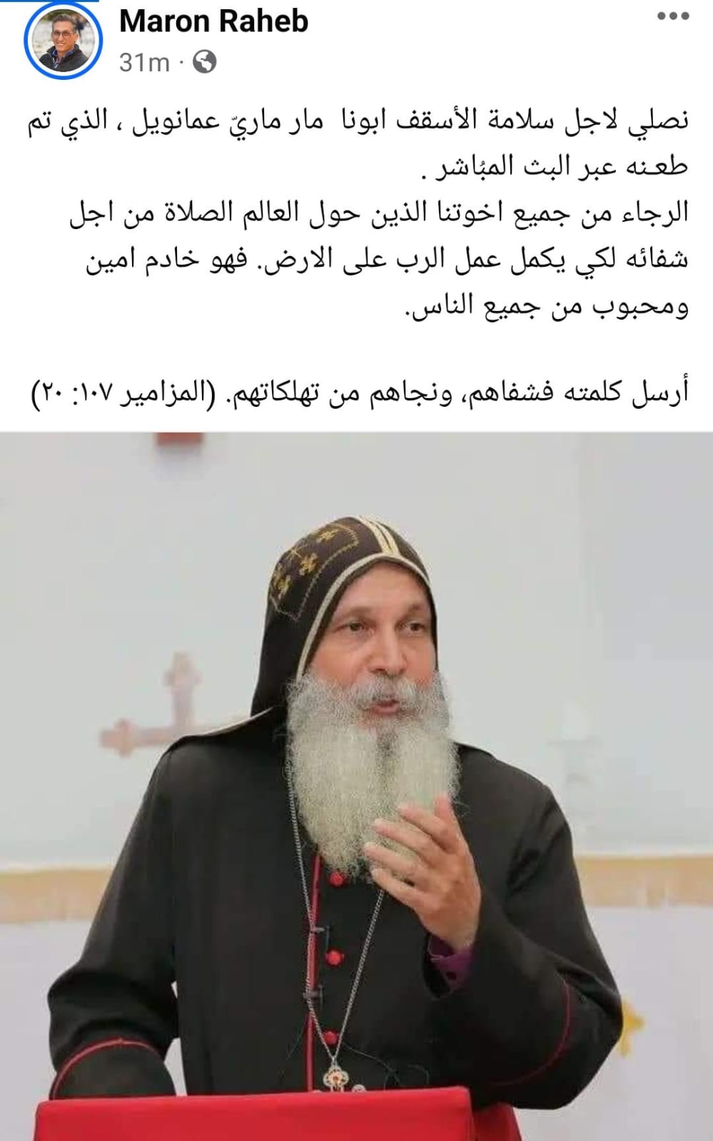 تعرض المطران مار ماري عمانوئيل الشهير بعظات على السوشيال ميديا، لطعن من قبل شاب داخل الكنيسة في أستراليا، خلال بث مباشر لعظته.