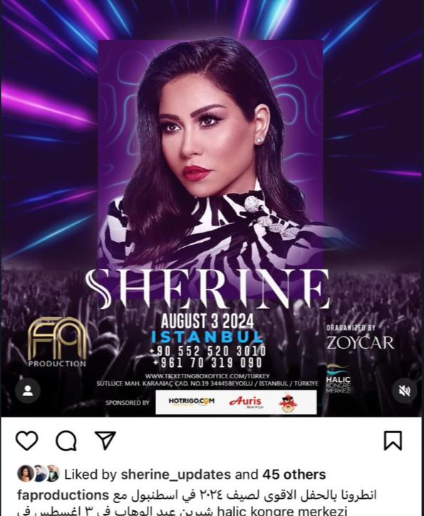 وتحيي الفنانة شيرين عبد الوهاب حفلا غنائيا بأسطنول بدولة تركيا، إذ نشرت الهيئة المنظمة للحفل عبر حسابها الشخصي على موقع تبادل الصور والفيديوهات إنستجرام بوستر الحفل، وعلقت عليه: انتظروا أقوى حفلات الصيف، النجمة شيرين عبد الوهاب في أسطنبول يوم 3 أغسطس.. صيف 2024.