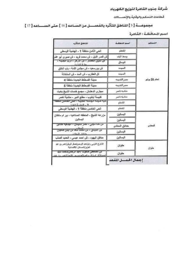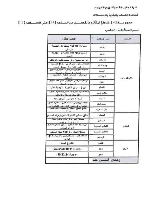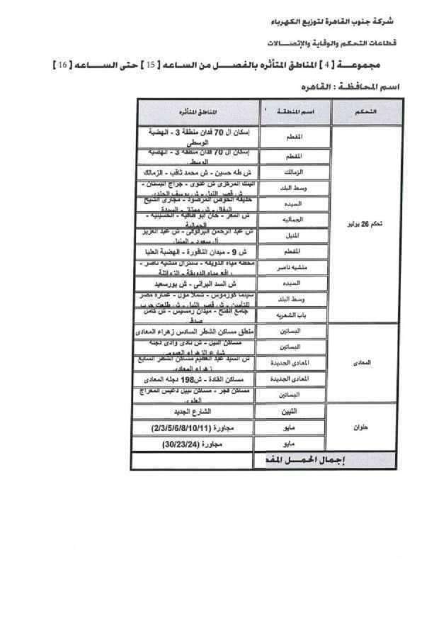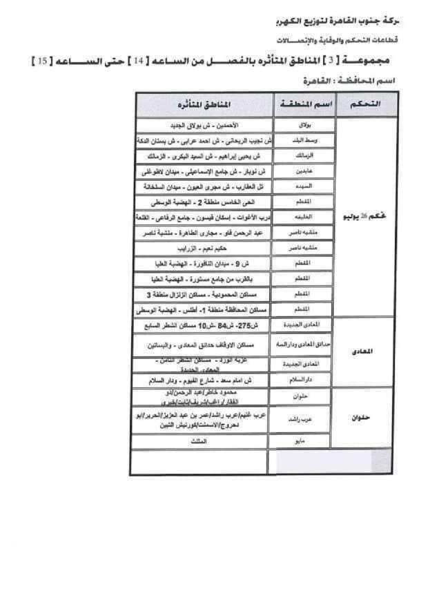 وجاءت مواعيد انقطاع الكهرباء، في منطقة الزمالك من الساعة 2 إلى الساعة 3 مساء، وكذلك منطقة المقطم وعابدين وبولاق ووسط البلد، وبعض مناطق المعادي.