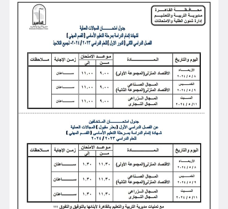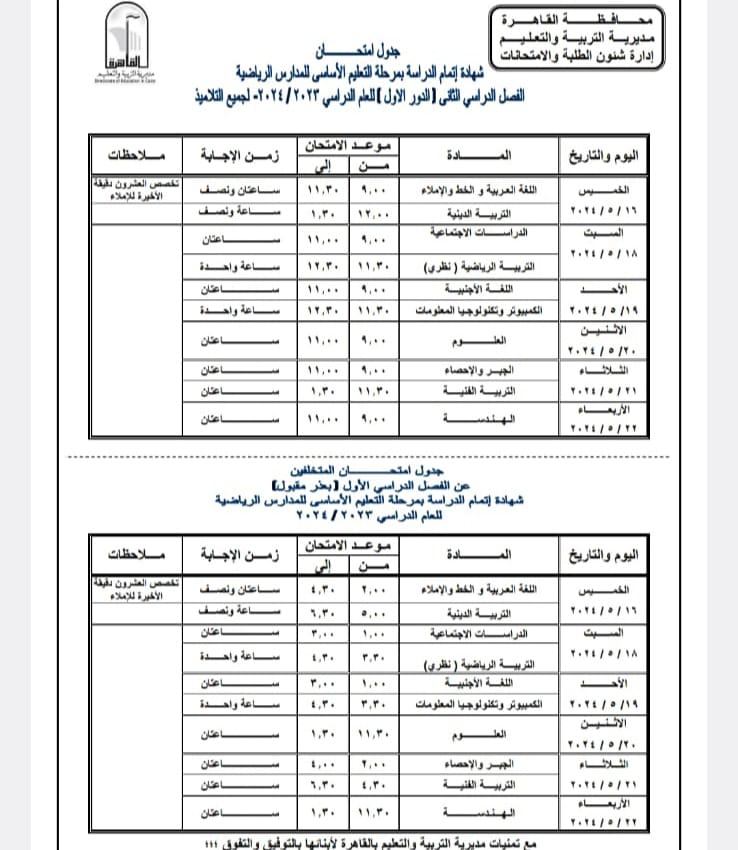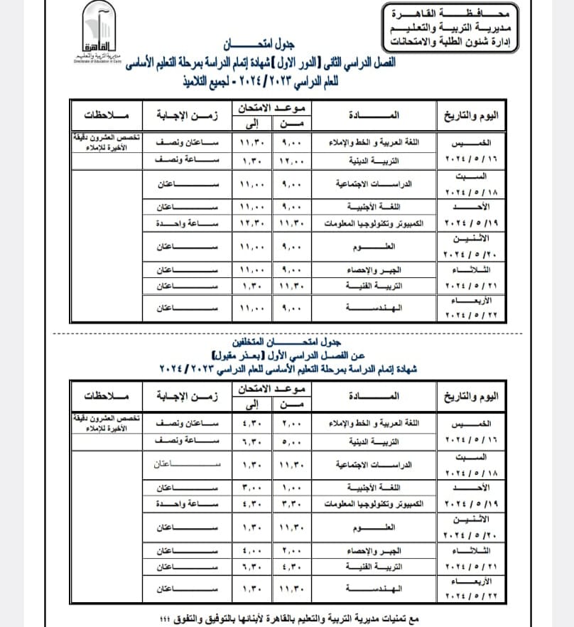 اعتمد اللواء خالد عبد العال، محافظ القاهرة، جدول امتحانات الفصل الدراسي الثاني للعام الدراسى2023- 2024 حيث تجرى الامتحانات خلال الفترة من 8 مايو إلى 23مايو 2024.