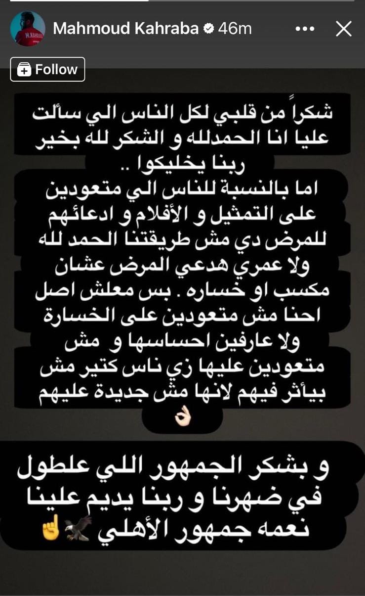 وقال محمود كهربا عبر حسابه الشخصي على موقع التواصل الاجتماعي إنستجرام: شكرًا من قلبي لكل الناس اللي سألت عليا أنا الحمد لله والشكر لله بخير ربنا يخليكوا.