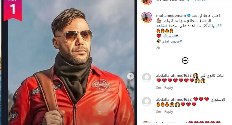 وشارك محمد إمام، متابعيه بوستر مسلسل كوبرا الذي يحمل صورته، وعلق عليه قائلًا: أحلى حاجة إن بعد الدوشة، تطلع منها نمرة واحد، كوبرا الأكثر مشاهدة على منصة شاهد.
