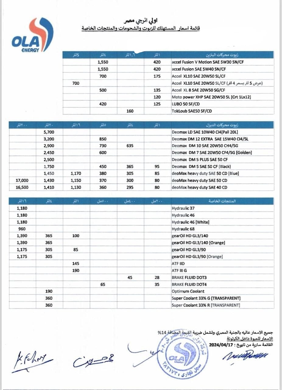 وجاءت أسعار زيوت محركات البنزين وزيوت محركات الديزل، لشركة أولى إنرجي مصر، المعلن تطبيقها اعتبارًا من اليوم الأربعاء كالتالي:
