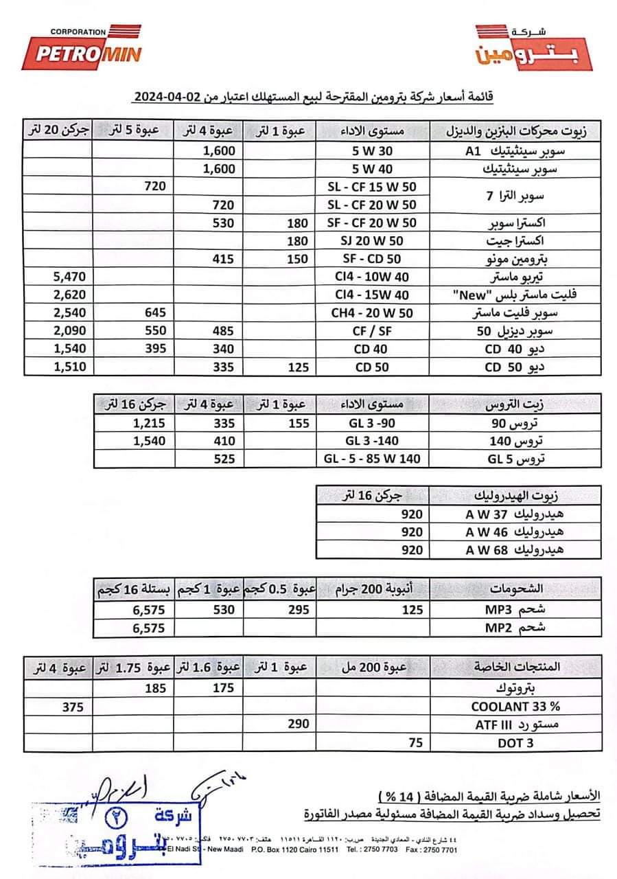 كما قررت شركة بترومين رفع أسعار منتجاتها من زيوت السيارات اعتبارًا من شهر أبريل الجاري، ذلك بعدما خاطبت جميع موزعيها على مستوى الجمهورية بالأسعار الجديدة، حيث جاءت كالتالي: