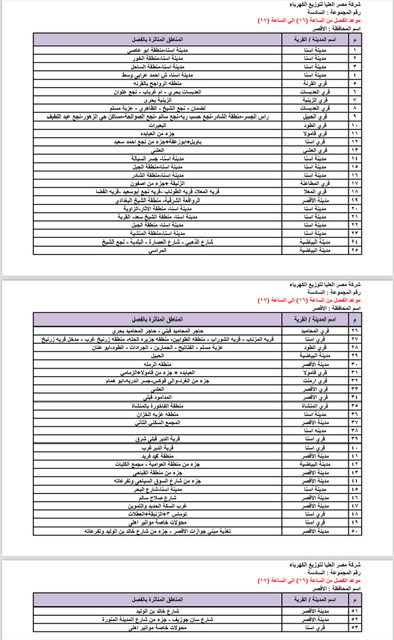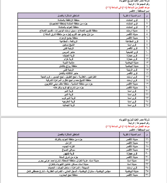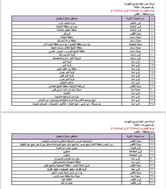 جدول تخفيف الأحمال وإنقطاع الكهرباء على مناطق الأقصر