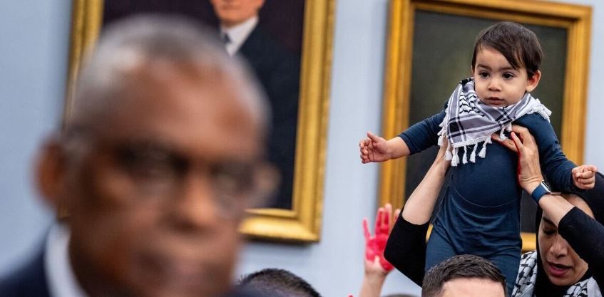 احتج نشطاء من منظمة نساء من أجل السلام على شهادة لويد أوستن وزير الدفاع الأمريكي، ورئيس هيئة الأركان المشتركة تشارلز براون، في جلسة الاستماع التي عقدتها لجنة المخصصات بمجلس النواب الأمريكي بشأن طلب ميزانية عام 2025، بعد أن انتقد نشطاء السلام الوزير أوستن بسبب إنكاره للحرب التي ترتكبها إسرائيل على غزة الأسبوع الماضي، ومن بين المتظاهرين كانت توجد سيدة فلسطينية أمريكية تدعى نسيبة حجاج، التي رفعت ابنها حمزة البالغ من العمر 16 شهرًا، وقالت: طفلي إنسان! توقفوا عن قتل الأطفال الفلسطينيين.