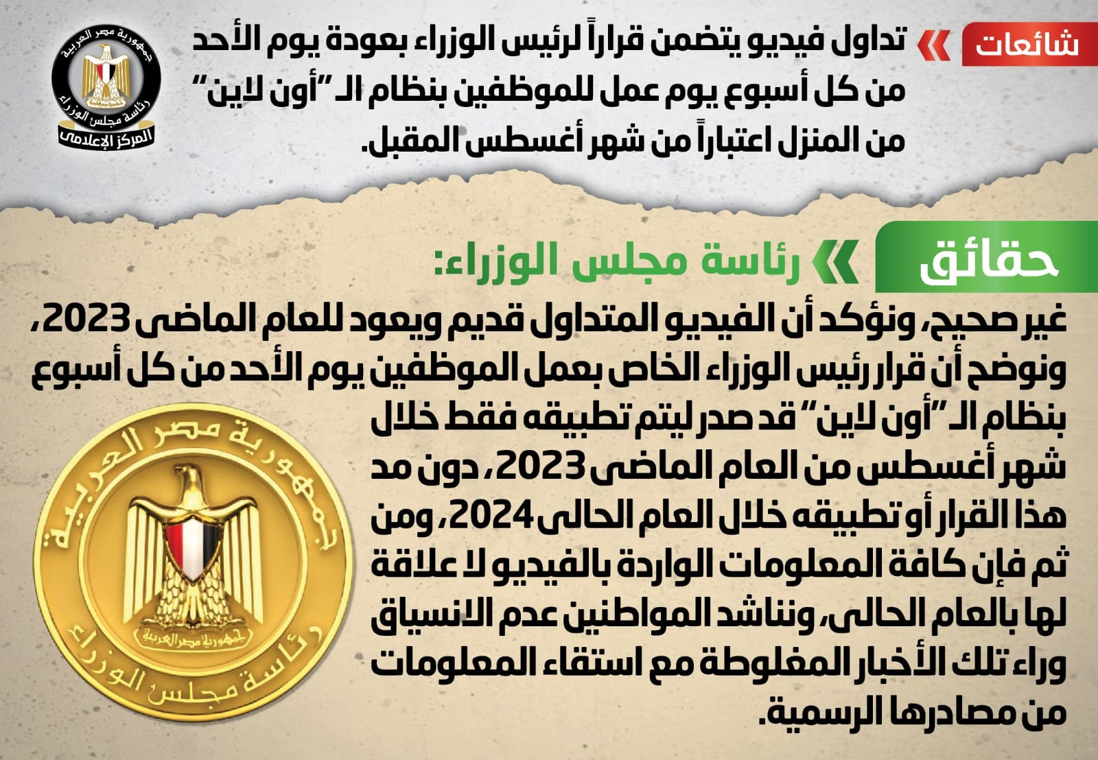 تداولت بعض صفحات التواصل الاجتماعي فيديو يتضمن قرارًا لرئيس الوزراء بعودة يوم الأحد من كل أسبوع يوم عمل للموظفين بنظام الـ أون لاين من المنزل، اعتبارًا من شهر أغسطس المقبل.