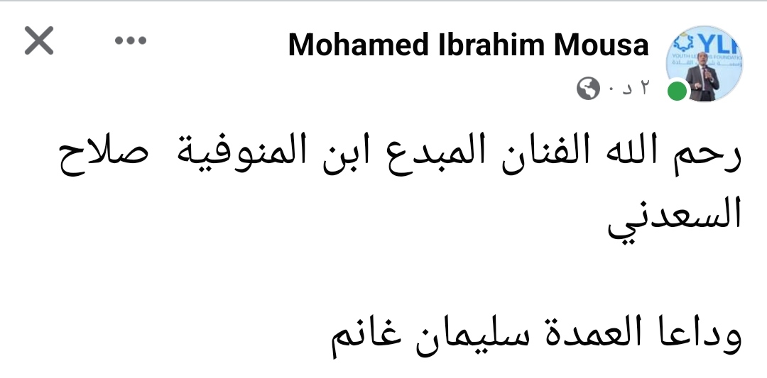 وكتب محمد موسى نائب محافظ المنوفية على صفحته الشخصية على موقع التواصل الاجتماعي فيسبوك: رحم الله الفنان المبدع ابن المنوفية صلاح السعدني، وداعا العمدة سليمان غانم.