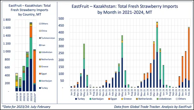 استوردت كازاخستان 820 طنًا من الفراولة المصرية الطازجة بين نوفمبر 2023 وفبراير 2024، في حين بلغ إجمالي الكمية الموردة لكازخستان في موسم 2022/23 280 طنًا.