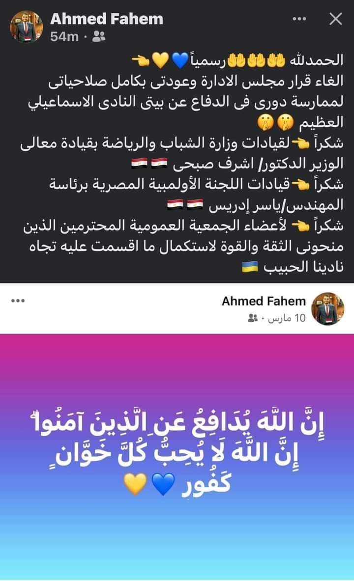 أعلن أحمد فهيم عضو مجلس إدارة الإسماعيلي الموقوف، عودته مرة أخرى لممارسة صلاحياته في مجلس الإدارة بعد صدور قرار من قبل بإيقافه من قبل مجلس الإسماعيلي.