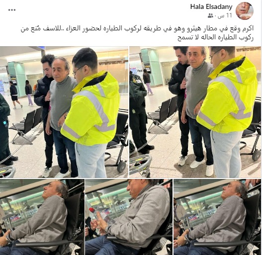 وشاركت هالة السعدني متابعيها بعدة صور لـ شقيقها أكرم السعدني، وذلك عبر حسابها الشخصي بموقع التواصل الاجتماعي فيس بوك، وعلقت عليها: أكرم وقع في مطار هيثرو وهو في طريقه لركوب الطيارة لحضور العزاء.. للأسف مُنع من ركوب الطيارة الحالة لا تسمح.