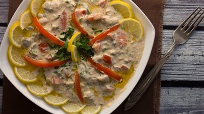 - توضع في طبق وتزين بالشبت والبقدونس ويمكن تقديم بجانبها البطاطس المحمرة والعيش الطازج وبألف هنا وشفا.