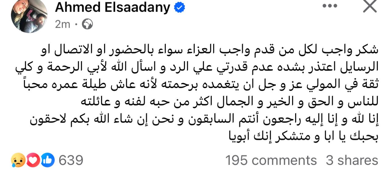 وكتب أحمد السعدني عبر صفحته بموقع فيس بوك: شكر واجب لكل من قدم واجب العزاء، سواء بالحضور أو الاتصال أو الرسائل، واعتذر بشدة عن عدم قدرتي على الرد واسأل الله لأبي الرحمة وكلي ثقة في المولى عز وجل أن يتغمده برحمته.