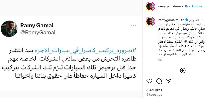 وكتب رامي جمال منشورا عبر حسابه الشخصي بموقع انستجرام جاء فيه: ضرورة تركيب كاميرا في سيارات الأجرة بعد انتشار طاهرة التحرش من بعض سائقي الشركات الخاصة، مهم جدا قبل ترخيص تلك السيارات تلزم تلك الشركات بتركيب كاميرا داخل السيارة، حفاظًا على حقوق بناتنا وأخواتنا.