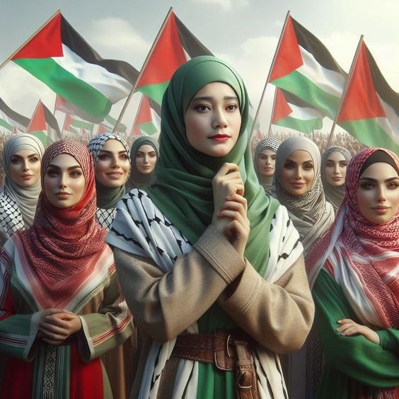 وفي هذه الصورة مجموعة من الفتيات الفلسطينيات يقفن بقوة وينظرن بقوة وصلابة رافعين العلم الفلسطيني في لقطة تبدو كما لو كان النصر محققًا في القريب العاجل.