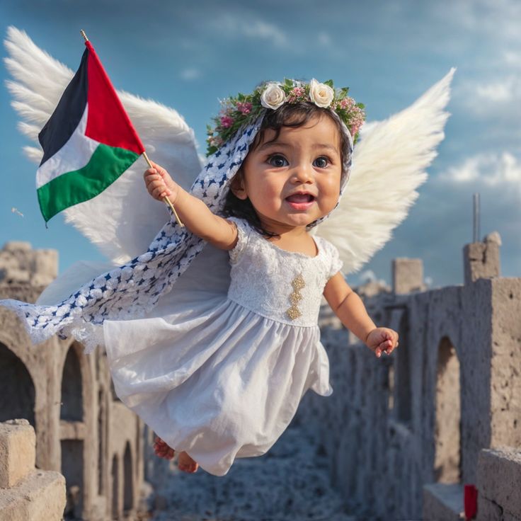 وفي هذه الصورة طفلة صغيرة تطير في السماء كالملاك يحمل العلم الفلسطيني في يديه، والشال الفلسطيني على رأسه، وتاج من الزهور على الشعر، وأجنحة بيضاء على الظهر، وهي دلالة على استشهاد تلك الصغيرة.