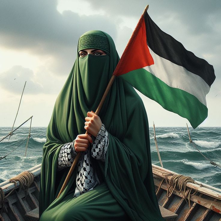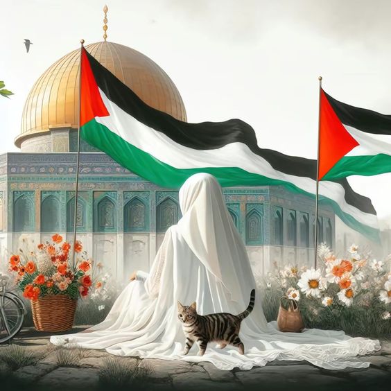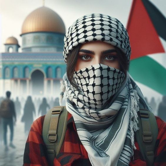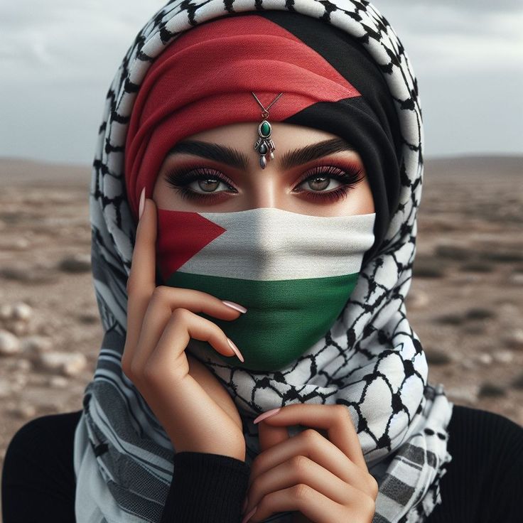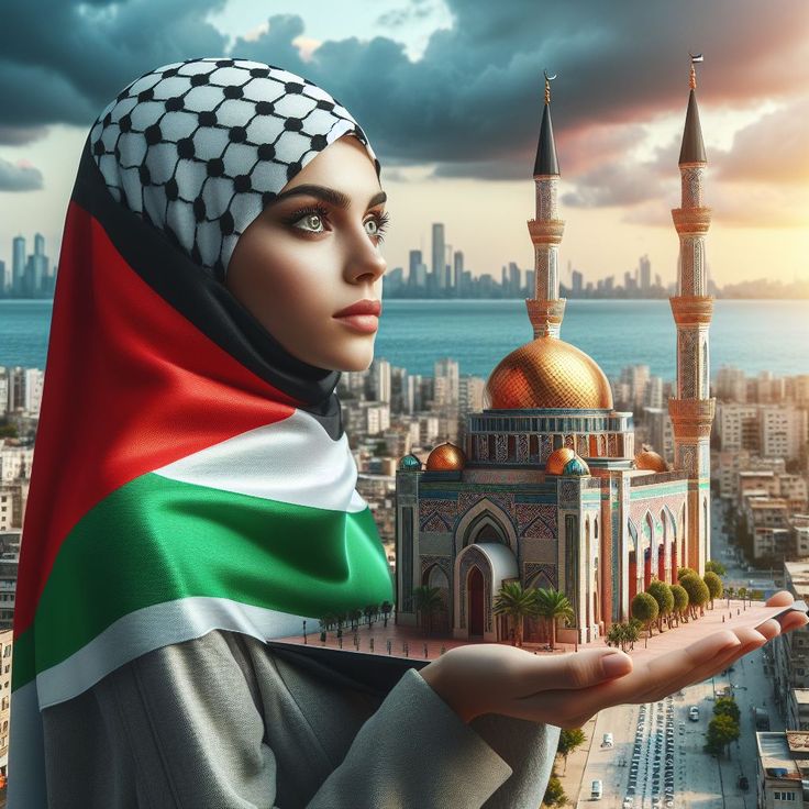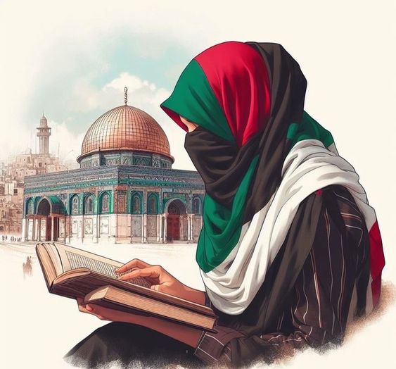وأما هذه الصورة فيها فتاة فلسطينية ترتدي الحجاب والنقاب بألوان العلم الفلسطيني، وتجلس تقرأ القرآن وورائها خلفية من مسجد قبة الصخرة.