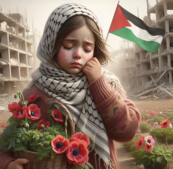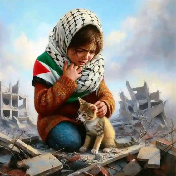 ومن صور بنات بعلم فلسطين أيضا، انتشرت هذه النوعية من الصور حيث الجلوس على أنقاض غزة بالحزن والبكاء، وتعير هذه الصورة عن الأسى لما يتعرض له الشعب الفلسطيني حتى الحيوانات الأليفة تبكي وتشكي همها لله تعالى.
