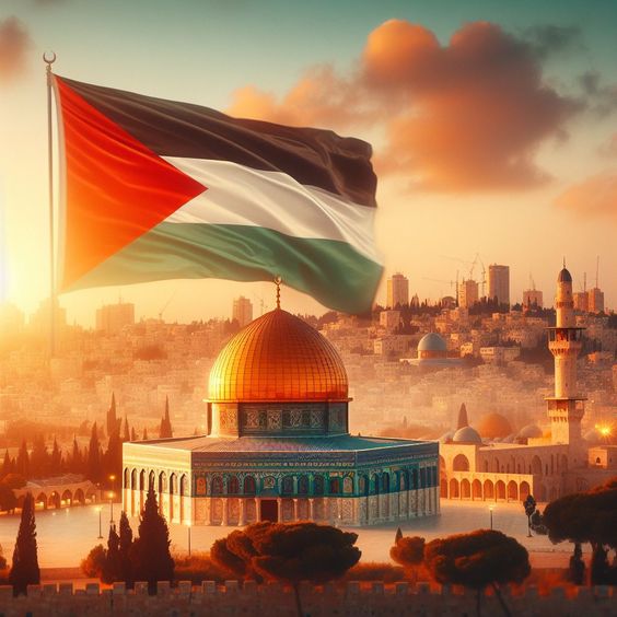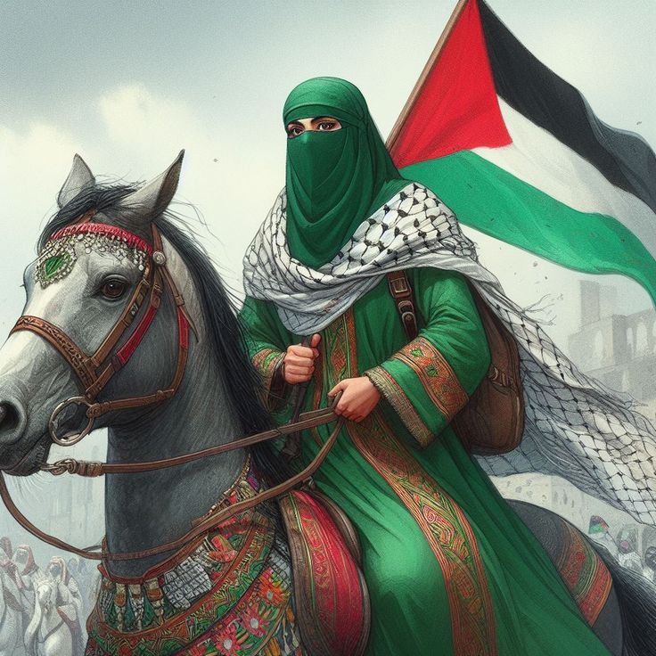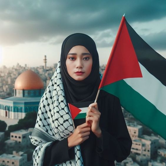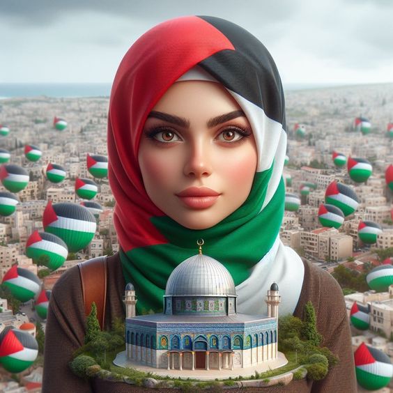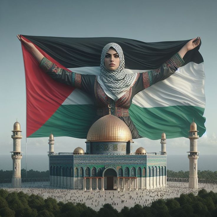 ومن ضمن صور بنات بعلم فلسطين، تظهر في هذه الصورة التعبيرية، الصلابة والصمود، حيث الفتاة التي تعلو قبة الصخرة وتحمل في يديها العلم الفلسطيني وبيديها الأخرى تعمل علامة القوة.