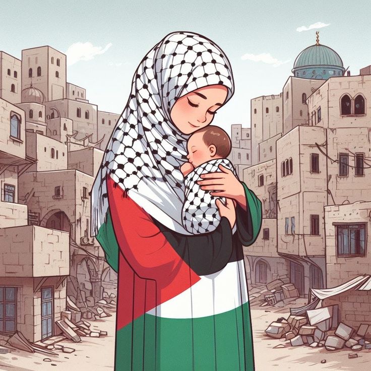 وهي صورة حزينة من صور بنات بعلم فلسطين، حيث الأم التي ترتدي العلم بألوانه من الأمام والشال الفلسطيني من الخلف وتحمل رضيعها وتحتضنه مع إغماض عيونهم كدلالة على الحزن.