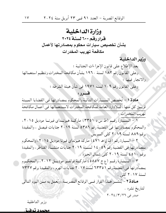 نشرت الجريدة الرسمية اليوم الثلاثاء 23 أبريل قرار وزير الداخلية رقم 600 لسنة 2024 بشأن تخصيص سيارات محكوم بمصادرتها لأعمال مكافحة تهريب المخدرات.