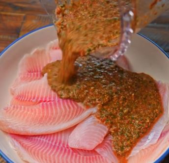 - قلبي تتبيلة السمك الفيليه جيدا ثم ضعي فيها شرائح السمك وقلبيه من كل الجهات.