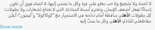 وانهالت التعليقات السلبية على نادي الأهلي، بعد عدم فسخ التعاقد مع شركة كوكاكولا فقال مستخدم، لا انتماء فوق أن تكون إنسانًا تفعل أضعف الإيمان، وتحترم أبسط المبادئ، التي لا تحتاج لشعارات ولا بطولات؛ كل بطولات الأهلي ساقطة أمام الاستمرار مع كوكاكولا وليبتون؛ أعلن مقاطعتي للنادي الأهلي وكل ما يمتّ إليه بأي شكل.