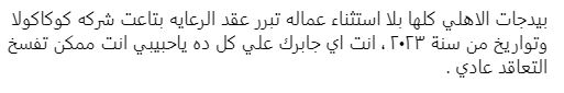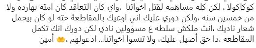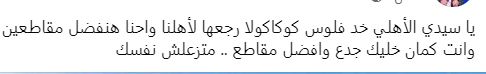 وتابع آخر، يا سيدي الأهلي خد فلوس كوكاكولا رجعها لأهلنا واحنا هنفضل مقاطعين وانت كمان خليك جدع وأفضل مقاطع، متزعلش نفسك.