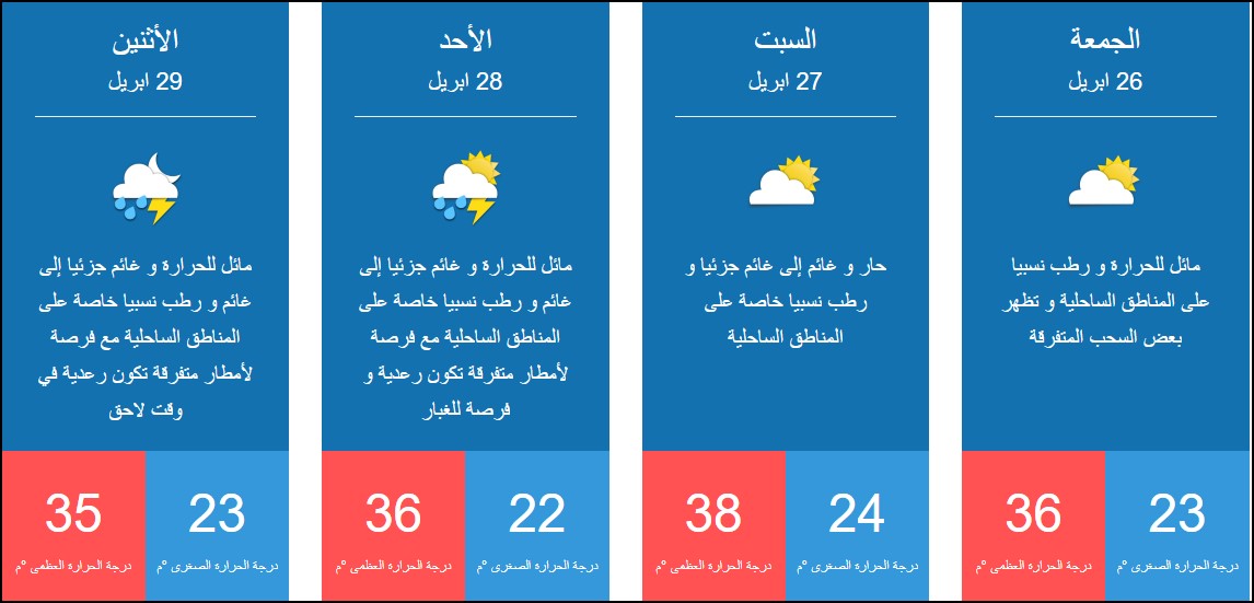 وخلال ساعات النهار، يسود طقس حار ورطب نسبيا على المناطق الساحلية والرياح متقلبة الإتجاه إلى جنوبية شرقية خفيفة إلى معتدلة السرعة 08 - 35 كم/ساعة.