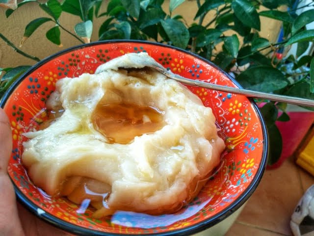 - بعد أن تهدأ العصيدة اقلبيها في طبق التقديم وصبي وفقها العسل الأبيض ومن الجوانب ضعي القشطة بدلا من السمنة.