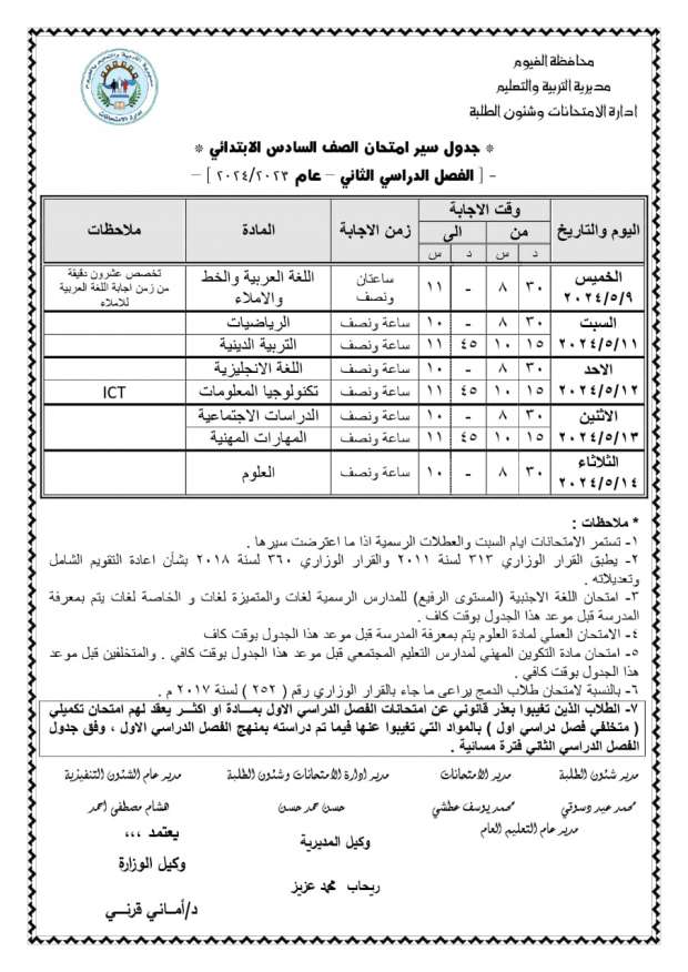 جدول امتحانات الصف السادس الابتدائي الترم الثاني 2024 الفيوم