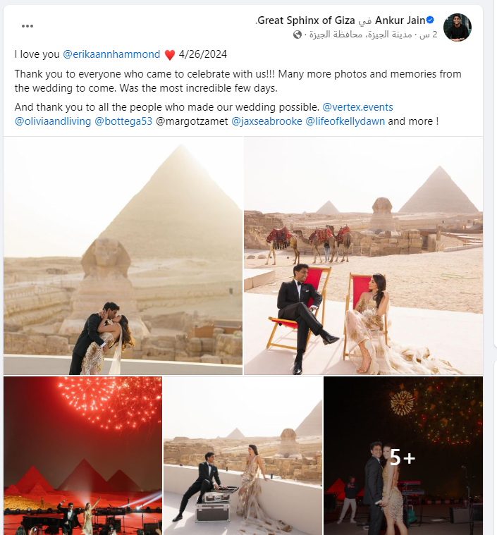 ونشر الملياردير الهندي، عبر صفحته الرسمية على الفيسبوك صورا من حفل الزفاف من أمام أهرامات الجيزة، كالتالي: