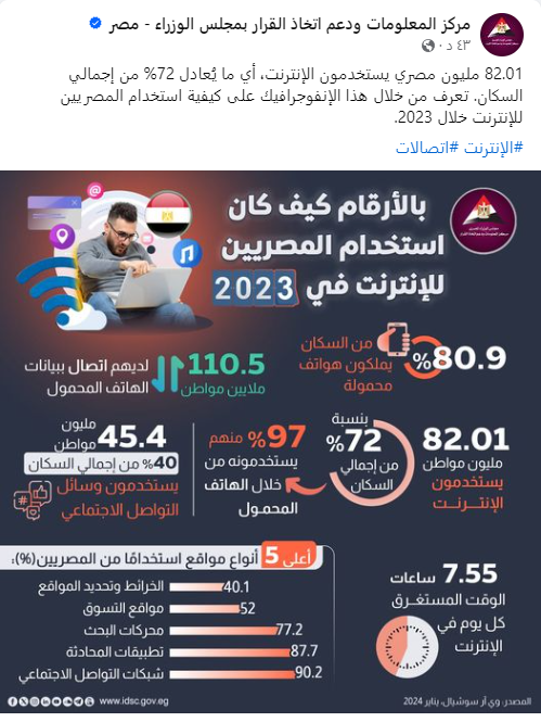 وأفاد معلومات الوزراء، خلال إنفوجراف منشور عبر صفحته الرسمية على فيس بوك، أن 97% من مستخدمي الإنترنت في مصر يستخدمونه من خلال الهاتف المحمول، مؤكدا أن 45.4 مليون مواطن بنسبة 40% من إجمالي السكان يستخدمون وسائل التواصل الاجتماعي.