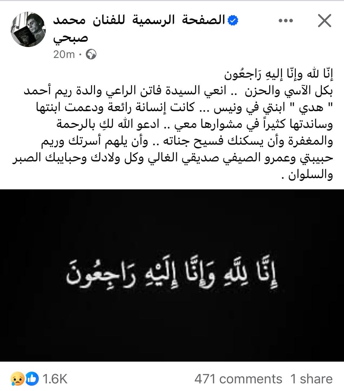 وأضاف محمد صبحي: كانت إنسانة رائعة ودعمت ابنتها وساندتها كثيرًا في مشوارها معي.. ادعو الله لكِ بالرحمة والمغفرة وأن يسكنك فسيح جناته.. وأن يلهم أسرتك وريم حبيبتي وعمرو الصيفي صديقي الغالي وكل ولادك وحبايبك الصبر والسلوان.