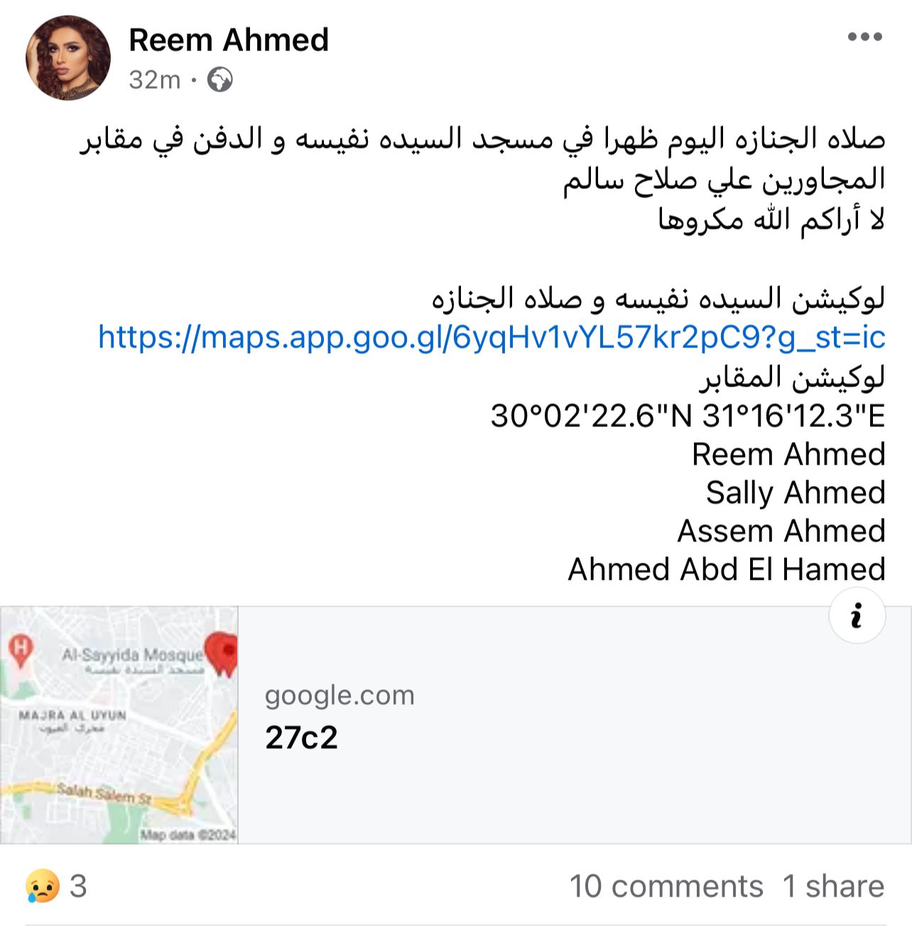 وكتبت ريم أحمد، منشورًا عبر حسابها الشخصي بموقع فيسبوك، قالت فيه: صلاة الجنازة اليوم ظهرا في مسجد السيدة نفيسة والدفن في مقابر المجاورين بطريق صلاح سالم، لا أراكم الله مكروها.