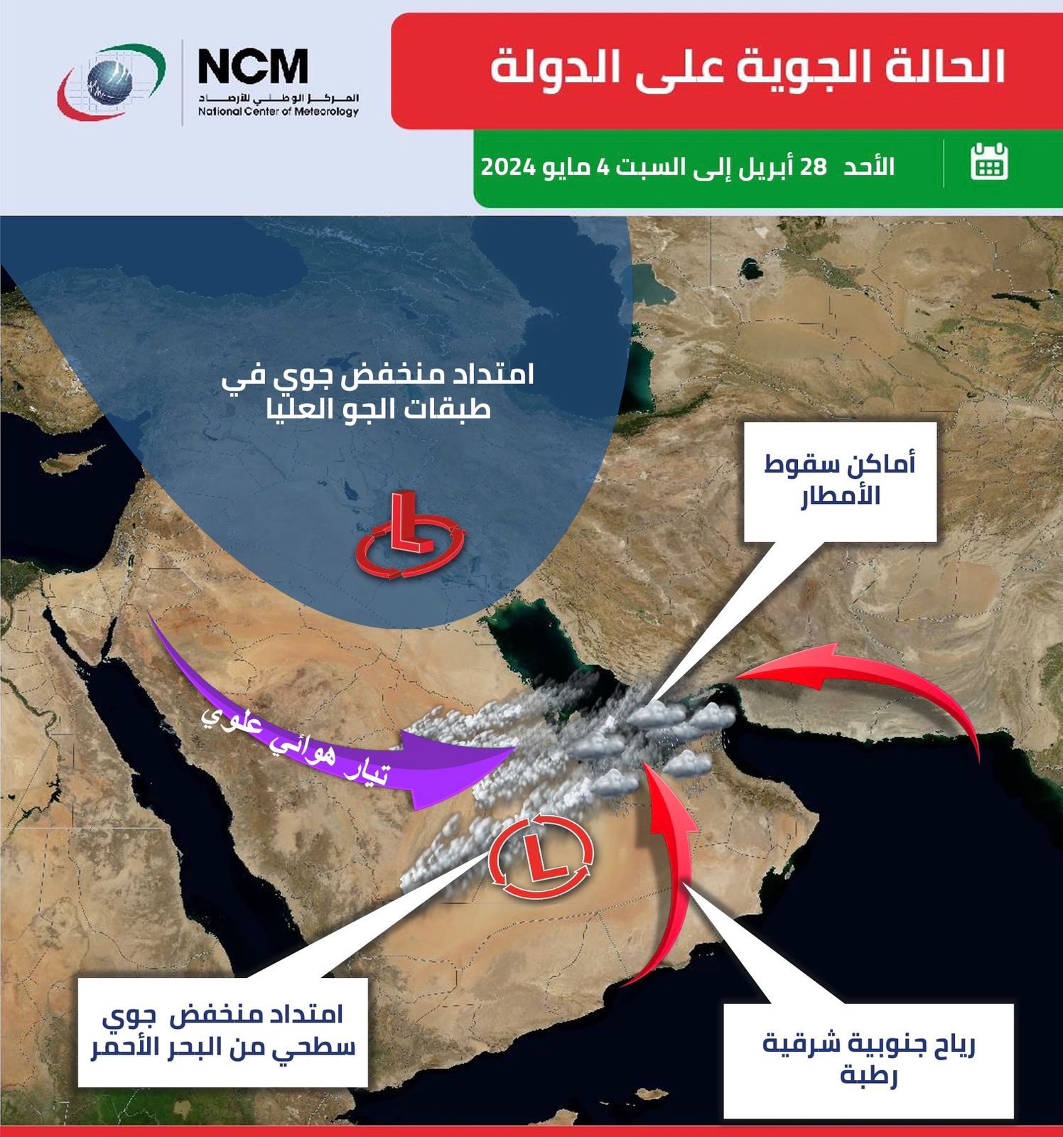 نشر المركز الوطني للأرصاد، توقعات الطقس في الإمارات الأيام القادمة، إذ تتأثر الدولة خلال اليوم الأربعاء وحتى 4 مايو الجاري بتبعات منخفضين جويين يتسببان في موجة اضطرابات.