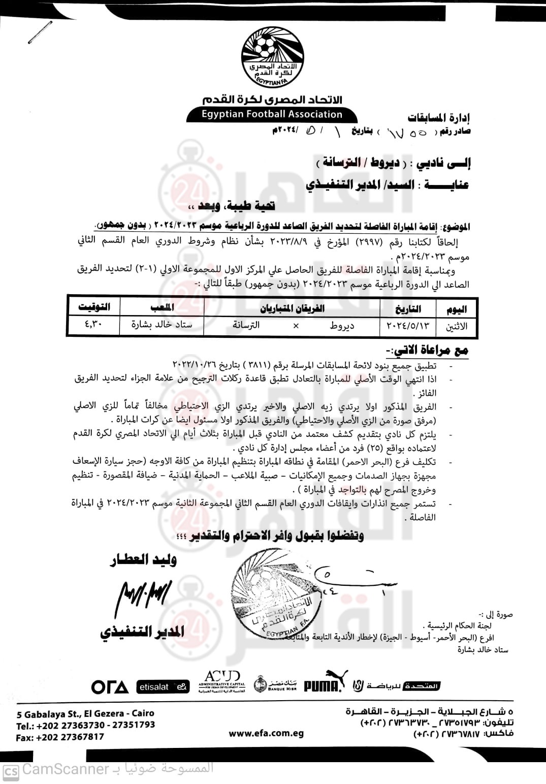أرسلت لجنة المسابقات بالاتحاد المصري لكرة القدم، إلى ناديي ديروط والترسانة خطابا يفيد بموعد إقامة وملعب المباراة التي ستجمع الفريقين في مباراة تحديد الفريق الصاعد إلى الدورة الرباعية.