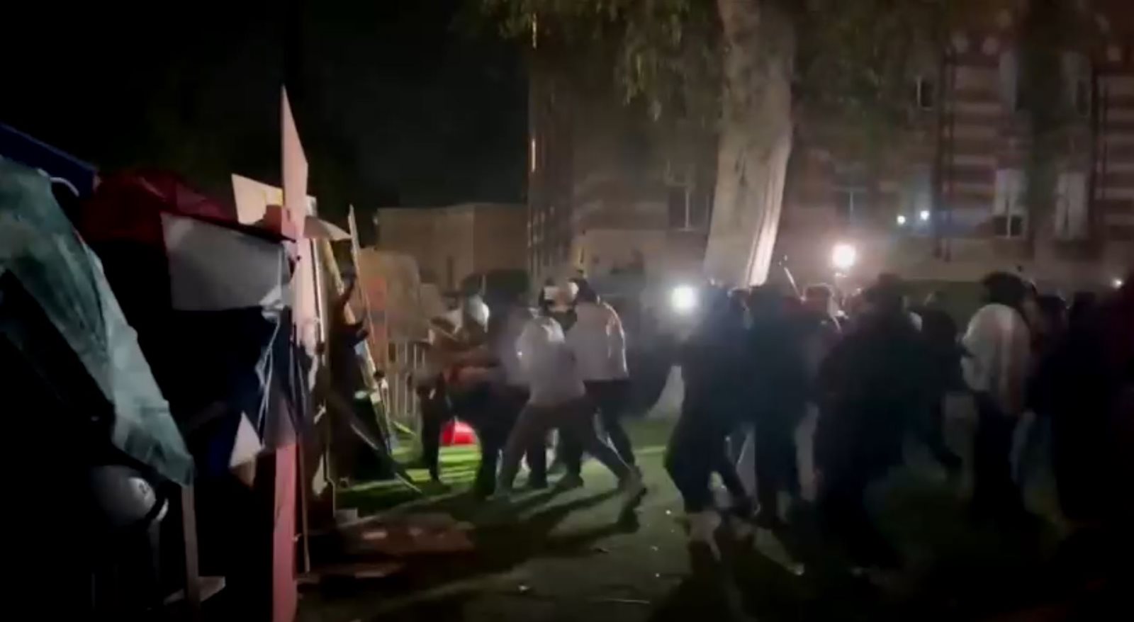 وأظهرت مقاطع فيديو لشهود عيان من جامعة كاليفورنيا، نقلتها رويترز، أشخاصًا يستخدمون العصي أو الأعمدة للطرق على ألواح خشبية تستخدم كحواجز مؤقتة لحماية المتظاهرين المؤيدين للفلسطينيين قبل استدعاء الشرطة إلى الحرم الجامعي.