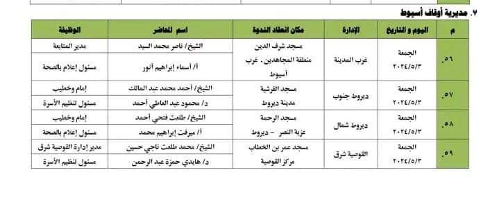أعلنت مديرية الأوقاف بمحافظة أسيوط، تنظيم 21 ندوة حول قضايا السكان والصحة الإنجابية، بالتعاون مع وزارة الصحة والسكان، وذلك بالمساجد الكبرى بالمحافظة.
