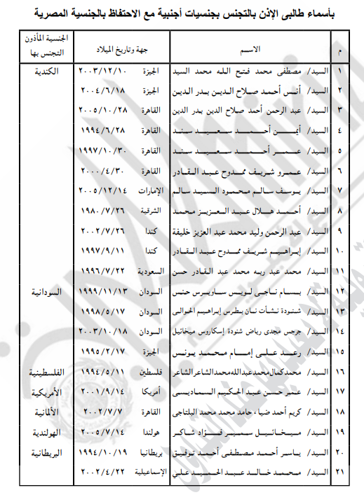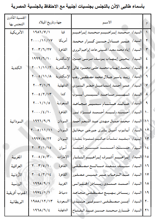 وجاء في القرار رقم 710 يؤذن لكل من الواحد والعشرين مواطنا أولهم محمد إبراهيم محمد إبراهيم وآخرهم طارق محمد حسن عبد الفتاح المدرجة أسماؤهم بالبيان المرفق بالتجنس بالجنسية الأجنبية الموضحة قرين اسم كل منهم، مع احتفاظهم بالجنسية المصرية.