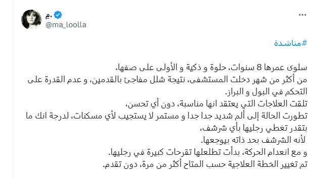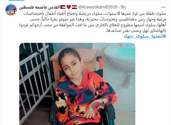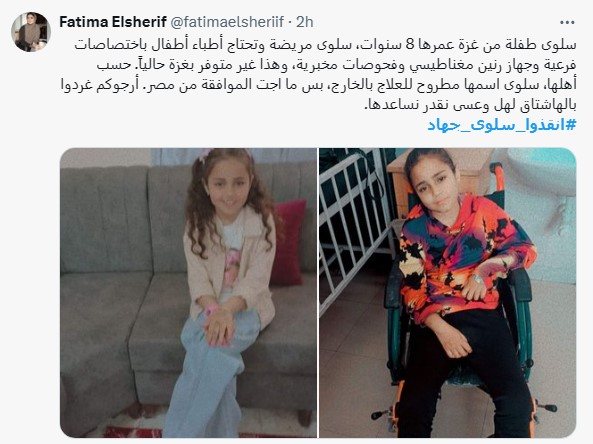 وكتب أحد المغردين عبر إكس: سلوى طفلة من غزة عمرها 8 سنوات، مريضة وتحتاج أطباء أطفال باختصاصات فرعية وجهاز رنين مغناطيسي وفحوصات مخبرية، وهذا غير متوفر بغزة حاليًا، وحسب أهلها، سلوى اسمها مطروح للعلاج بالخارج، أرجوكم غردوا بالهاشتاج لعل وعسى نقدر نساعدها.