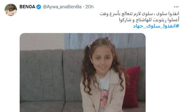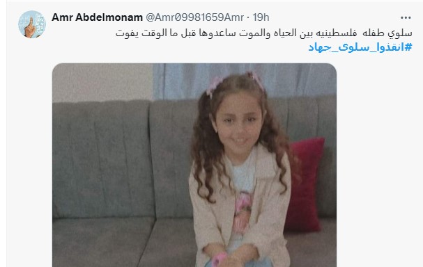 وشاركت إحدى المُغردين، قائلة: سلوى طفلة فلسطينية بين الحياة والموت ساعدوها قبل ما الوقت يفوت، ومُغرد آخر يكتب: دايمًا كلامنا بيجيب نتيجة وصوتنا بيوصل، اعتبر سلوي اختك او بنتك..بإذن الله ربنا هيكون معاها وتتعالج.