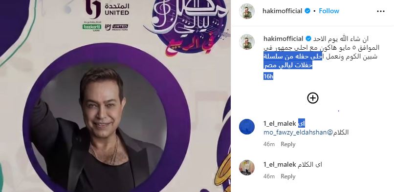 يستعد الفنان حكيم لإحياء حفلًا جماهيريًا اليوم الأحد الموافق 5 مايو، داخل نادي سيتي كلوب بمدينة شبين الكوم بمحافظة المنوفية، ضمن مشروع ليالي مصر، ومن المقرر أن يقدم على مدار الحفل باقة ألمع أغانيه التي يحبها الجمهور ويتفاعل معها.