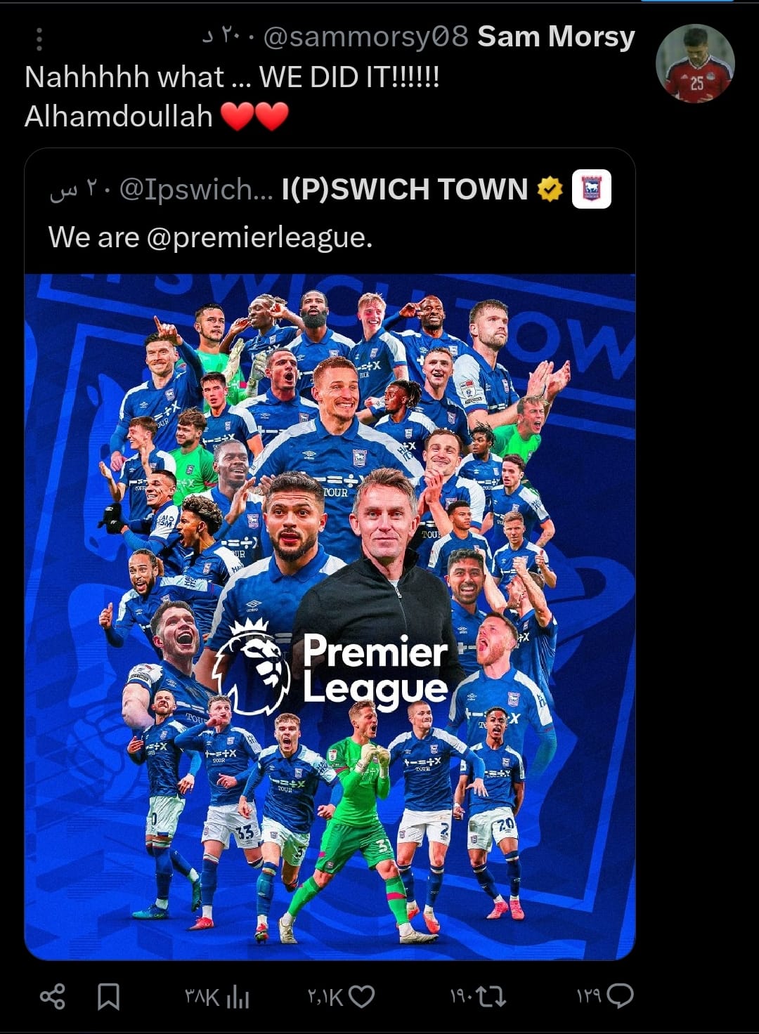 علّق سام مرسي محترفنا المصري ضمن صفوف فريق إيبسويتش تاون، على صعود الفريق إلى الدوري الإنجليزي الممتاز للمرة الأولى منذ 22 عاما.