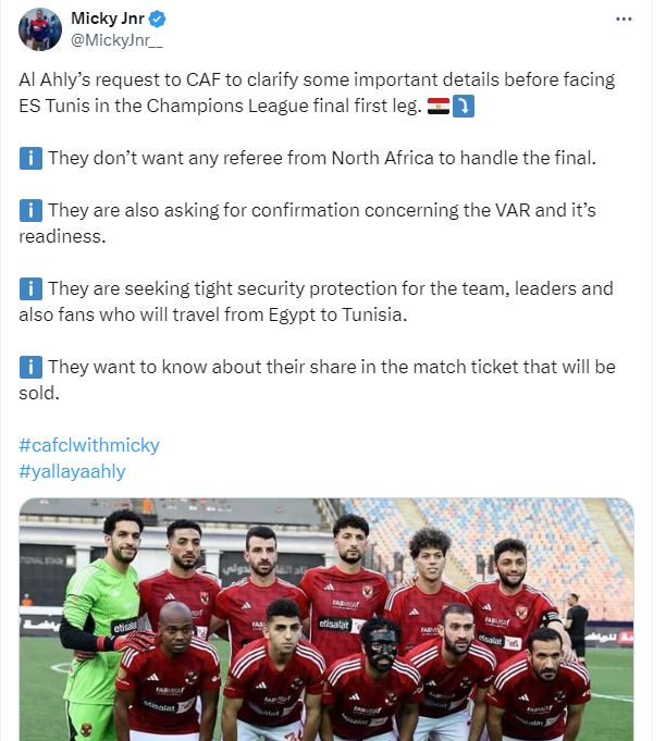 وفقًا للصفحي المالي ميكي جونيور المتخصص في الشأن الإفريقي، فإن النادي الأهلي طالب كاف توضيح بعض التفاصيل المهمة، قبل مواجهة الترجي التونسي في ذهاب نهائي دوري أبطال إفريقيا.