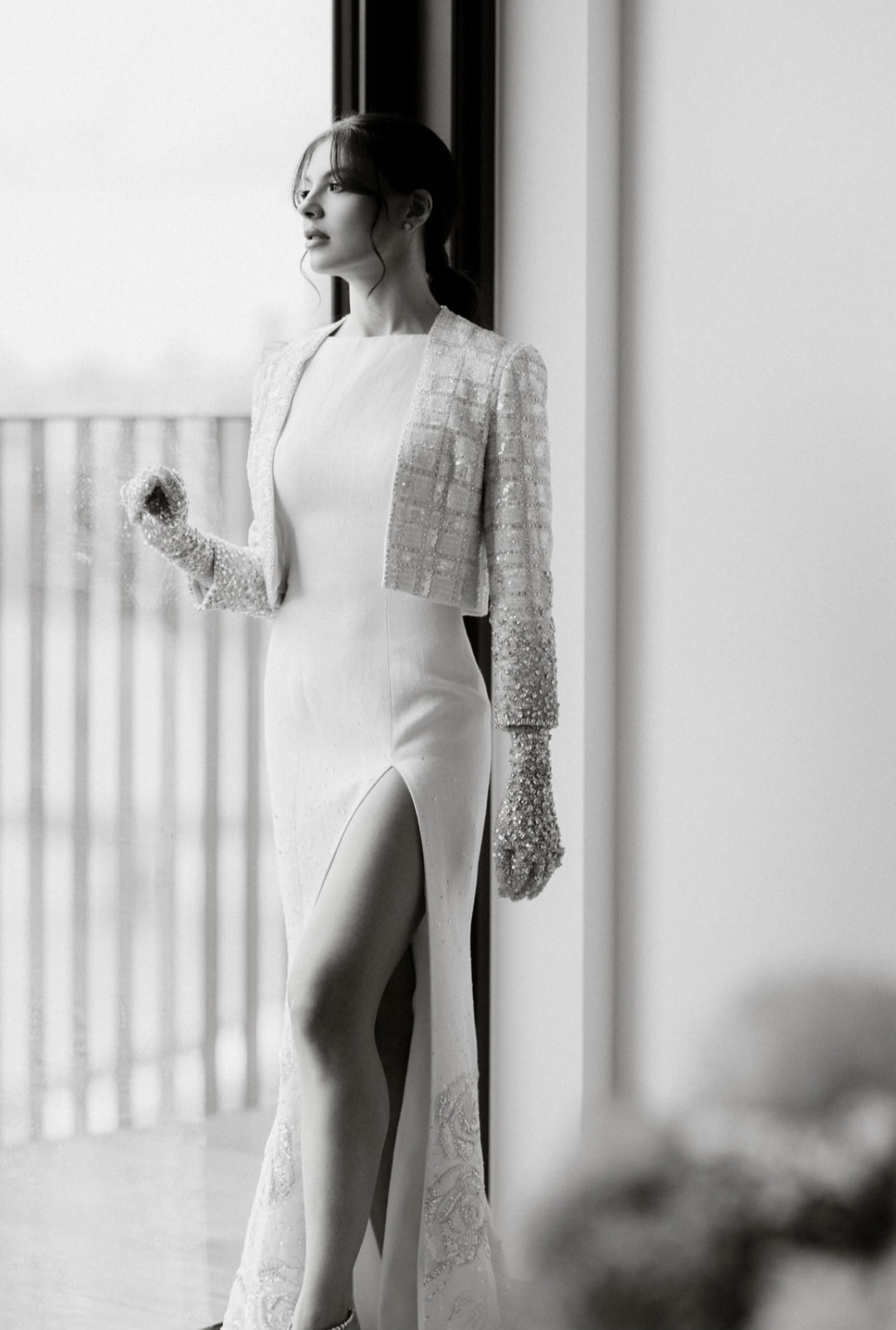 بحسب وسائل الإعلام اللبنانية، تألقت مايا رعيدي بفستان من توقيع المصمم العالمي جورج حبيقة، الذي جاء بتصميم بسيط طويل وضيق مطرز بالورود عند الأطراف السفلية للتنورة والستراس المتناثر على كامل الثوب، مع فتحة جانبية بطول الساق، وتم تنسيق الفستان الذي تميز بأكمام طويلة بتطريزات براقة، مع بلايزر قصيرة بالتطريزات نفسها، وقفازات ناعمة تكسوها حبيبات الستراس واللؤلؤ لإكمال إطلالة العروس الناعمة.