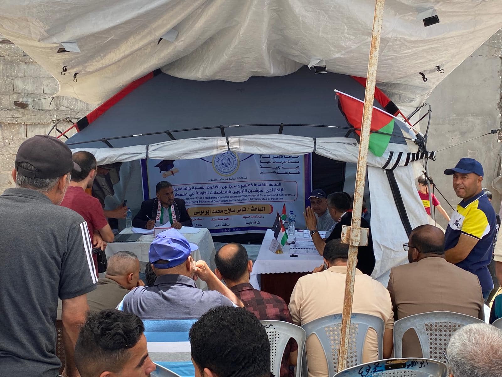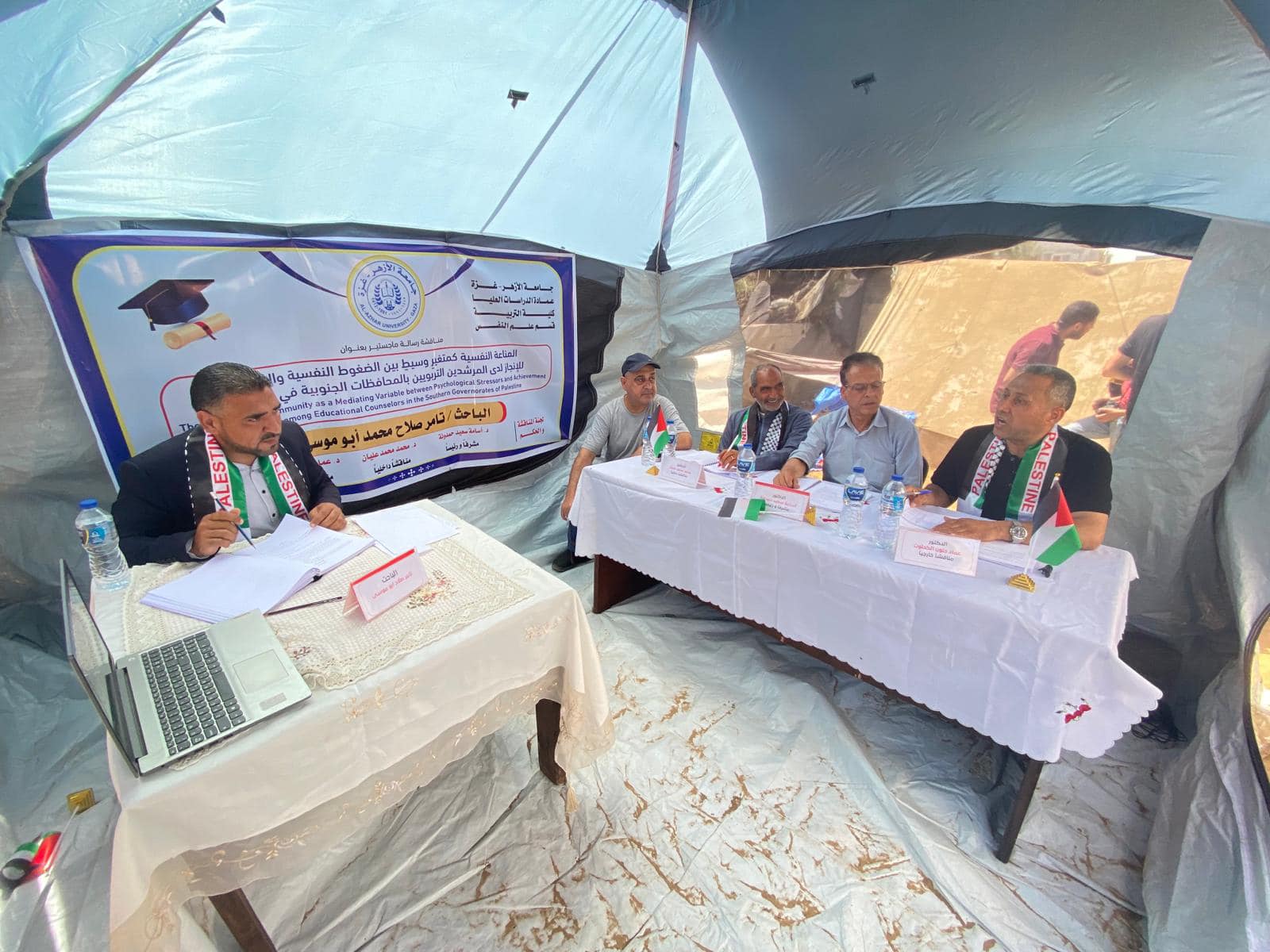 مناقشة رسالة ماجستير في خيمة بـ غزة