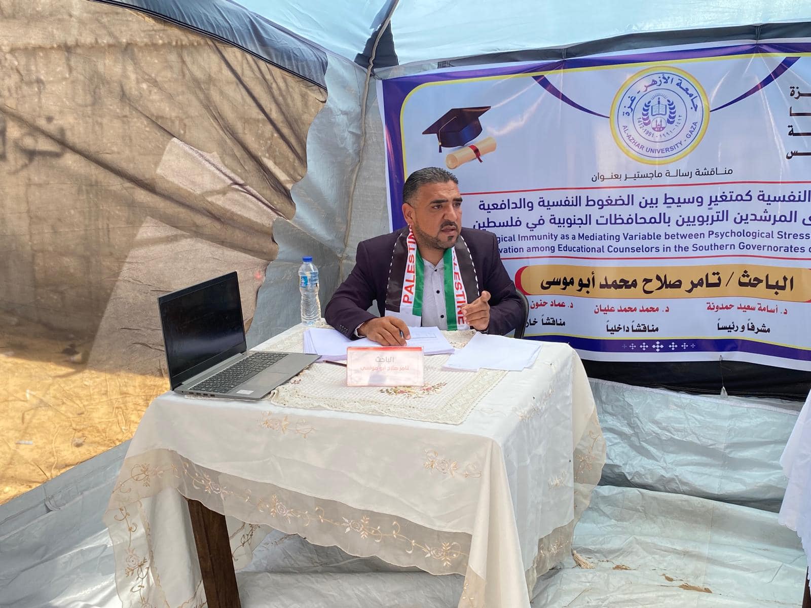 وناقشت كلية الدراسات العليا بجامعة الأزهر في قطاع غزة، أمس الأحد، رسالة الماجستير للباحث تامر صلاح أبو موسى بعنوان: المناعة النفسية كمتغير وسيط بين الضغوط النفسية والدافعية للإنجاز لدى المرشدين التربويين بالمحافظات الجنوبية في فلسطين، في إحدى خيام النازحين بالقطاع.