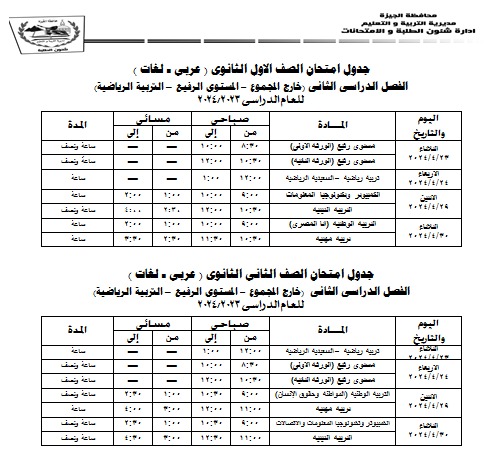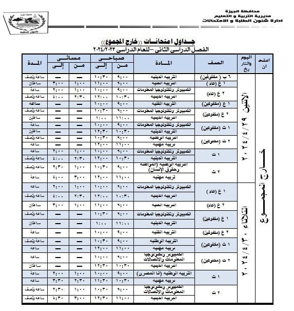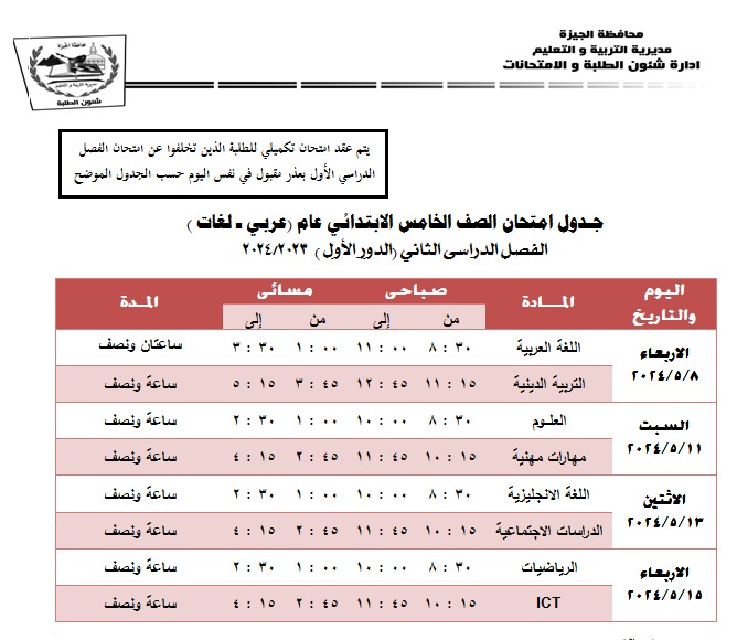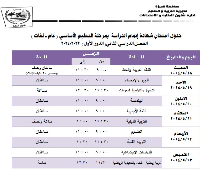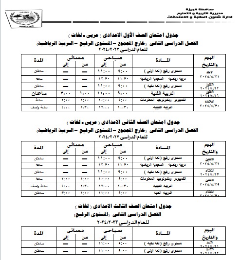 جاءت جداول امتحانات الفصل الدراسي الثاني لطلاب مدارس الجيزة وفقا لما أعلنته مديرية التربية والتعليم بمحافظة الجيزة كالآتي:
